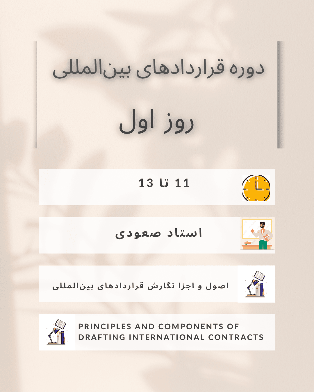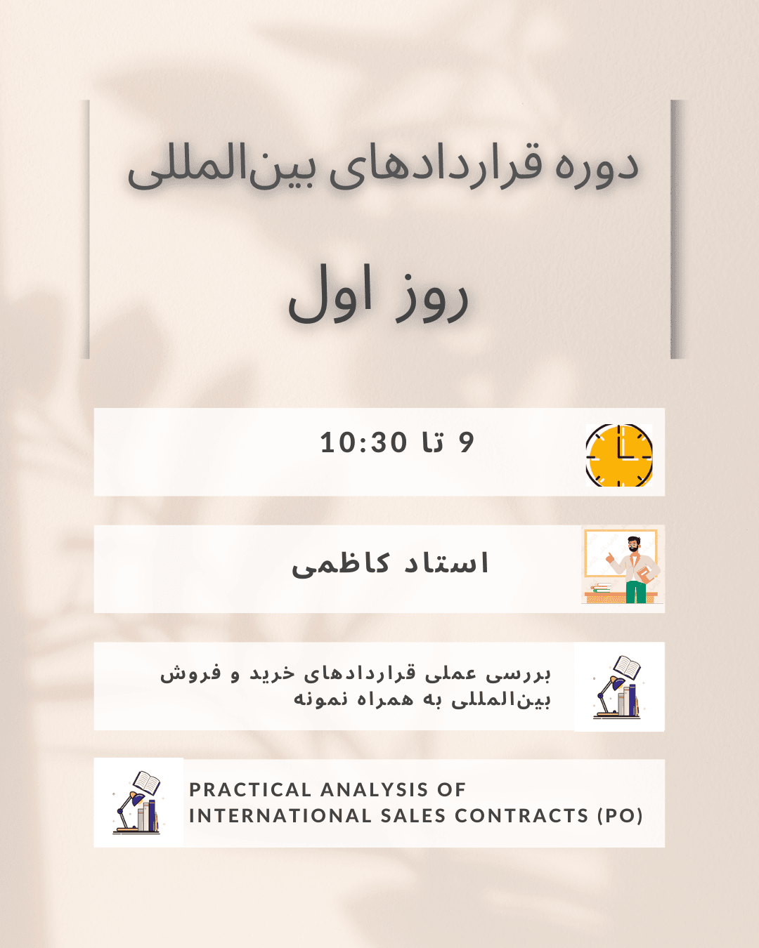 جلسه اول (ساعت ۹ تا ۱۱:۳۰): بررسی عملی قراردادهای خرید و فروش بینالمللی به همراه نمونه قرارداد | ارائه: دکتر کاظمی