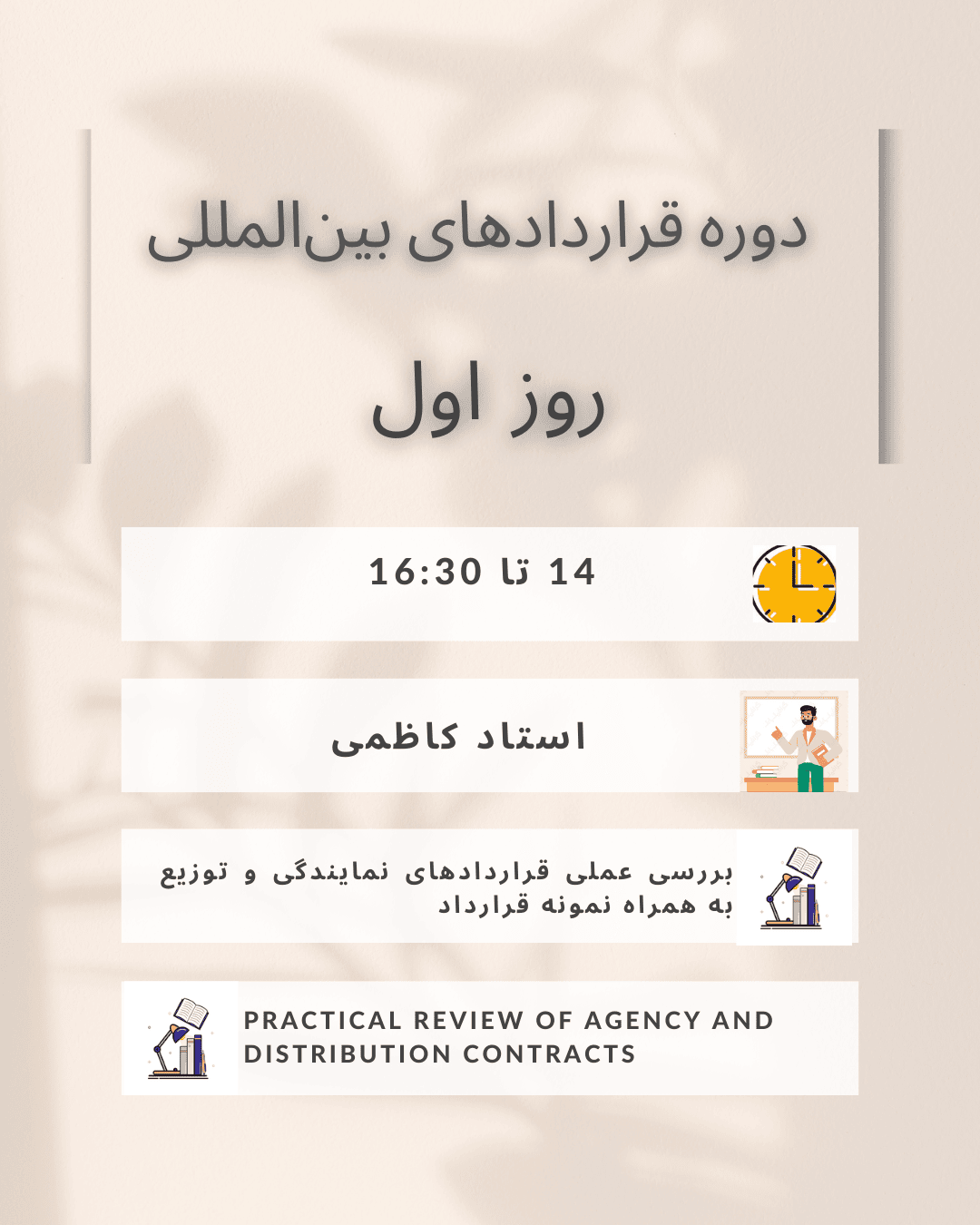 جلسه دوم (ساعت ۱۴ تا ۱۶:۳۰): بررسی عملی قراردادهای نمایندگی و توزیع به همراه نمونه قرارداد | ارائه: دکتر کاظمی