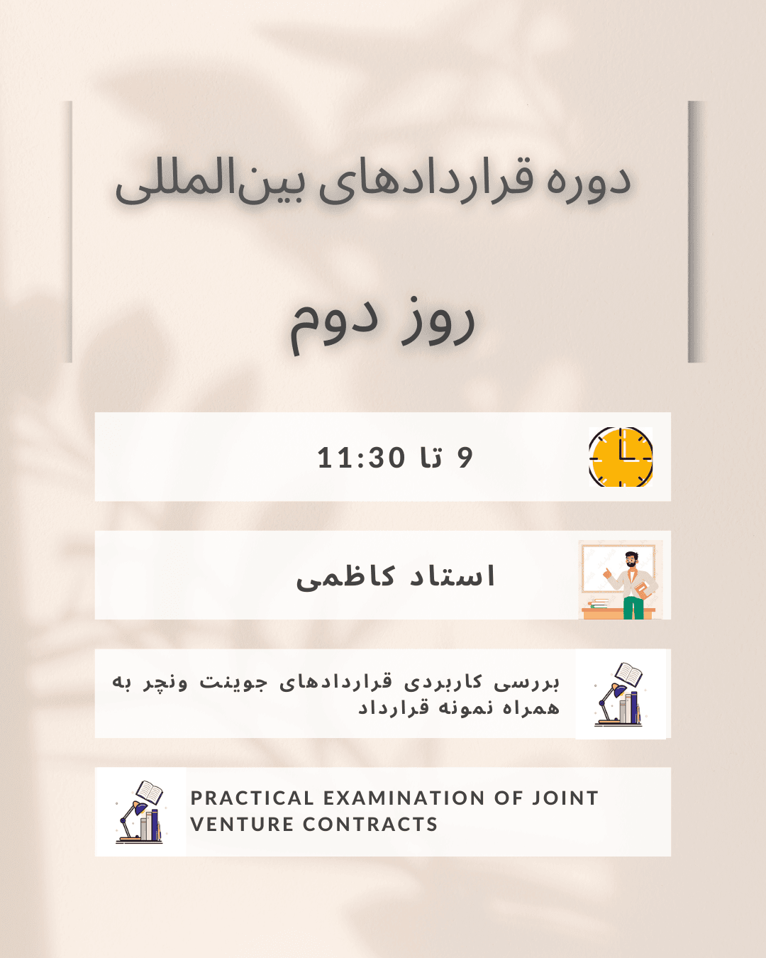 جلسه اول (ساعت ۹ تا ۱۱:۳۰): بررسی کاربردی قراردادهای جوینت ونچر به همراه نمونه قرارداد | ارائه: دکتر کاظمی