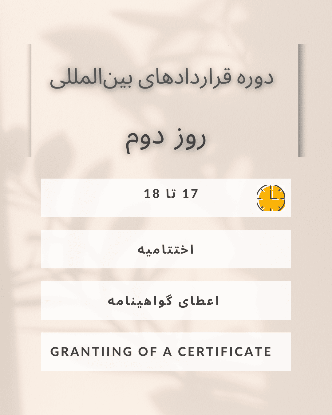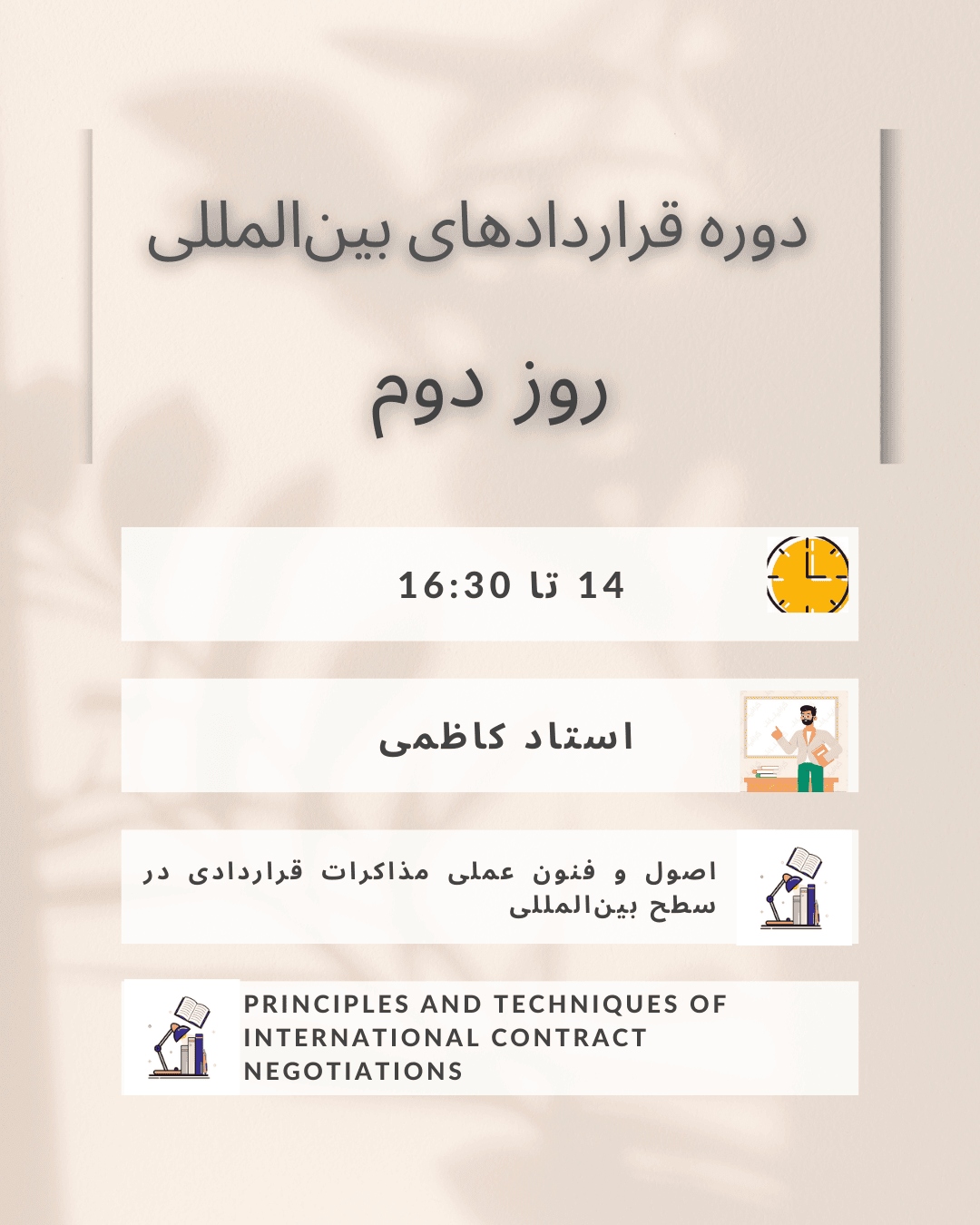 جلسه دوم (ساعت ۱۴ تا ۱۶:۳۰): اصول و فنون عملی مذاکرات قراردادی در سطح بینالمللی | ارائه: دکتر کاظمی